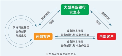 第一,大型商业银行云生态与业务生态的关系。由于云生态是业务生态的信息化基础,大型商业银行的云生态不仅可以快速赋能业务生态,还在对外输出技术后会形成一批使用云技术的同业/异业(外部)客户群体,构成云生态。