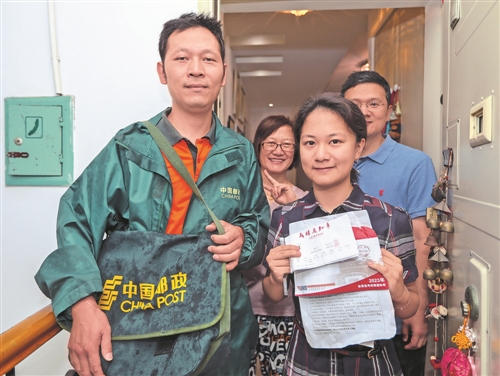 按照集团公司的有关部署要求,上海邮政精心制定了此次高考成绩通知单邮件处理和投递方案,采取增加早晚班投递、电话联系约定投递、延长高考成绩通知单邮件查询时间、严格按EMS邮件要求组织投递等多项措施,确保各环节无缝衔接、邮件及时投递到户。图为邮递员冒雨将高考成绩通知单邮件送到考生手中。 □上海记者 许雨舟 摄影报道