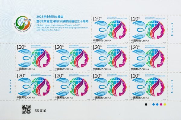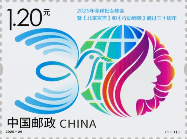 中国邮政定于2025年10月13日发行《2025年全球妇女峰会暨〈北京宣言〉和〈行动纲领〉通过三十周年》纪念邮票1套1枚,邮票图案名称为:2025年全球妇女峰会暨《北京宣言》和《行动纲领》通过三十周年。全套邮票面值1.20元,计划发行数量为460万套。