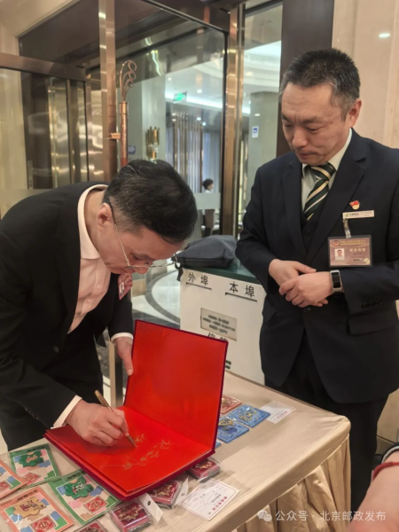 北苑邮政支局服务团队提前进驻驻地,与大会总务组进行对接并进行了有针对性的岗前练兵。“会议前期,我们围绕邮品特色讲解、政务服务礼仪、智能设备操作规范等开展多轮专项培训,确保服务精准高效。”北苑邮政支局局长贯立鑫介绍。6名团队成员场内场外分工协作,更创新推出“一对一”邮品咨询、纪念戳加盖指导等便民举措,并针对老年代表委员安排专人协助,力求服务贴心周到。
