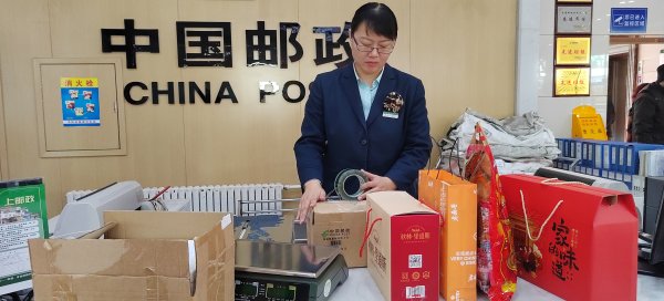 沿着年货展柜一路走到寄递专区。这里的忙碌与年货节的热闹交相呼应。邮政工作人员正埋头打包封装年货,胶带的撒拉声,纸箱的叠放声,汇成了一首新年序曲。“临近新年,年货的寄递量迅猛增长,我们加班加点,守好节日寄递的每一道关。”工作人员的话语朴实而坚定。