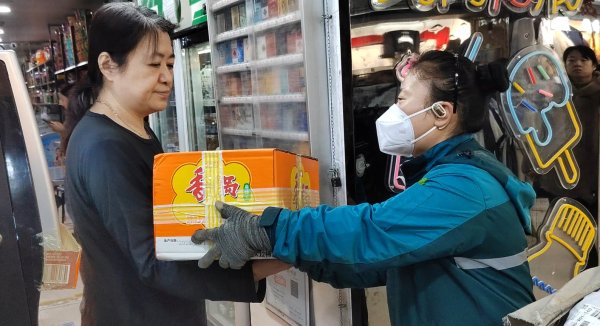 记者跟着揽投员马丽推着小车,一起为地下商城的客户送去年货。由于途中要下很长的一段楼梯,瘦瘦小小的她搬运年货邮件时小心细致,她说:“过新年,就要开开心心,我把邮件完好无损地送到客户手中,是一种责任,也是给客户的新年祝福。