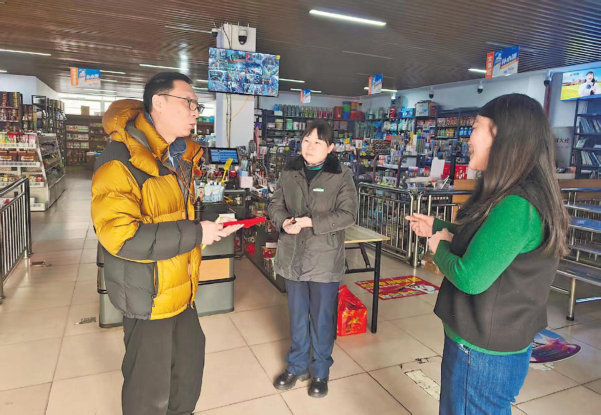 记者(左一)与朱桂华(中)一同走访商超客户。□彭红坤 摄