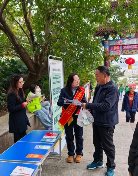在望王山半山腰的八角亭里,支行青年志愿者们组成“流动宣传小分队”,融入登山人流。在一棵挂满祈福红绸的古柏树下,志愿者们巧借“插柏丫”习俗,向歇息市民面对面讲解“一次性信用修复政策”,普及征信知识:“个人征信就像这棵柏树的根基,根基不稳,以后贷款买房、娃娃上学都受影响。”生动的比喻让复杂知识变得通俗易懂,市民李女士感慨:“以前觉得征信离自己很远,今天才晓得保护好信用就是保护自己的‘钱途’。”